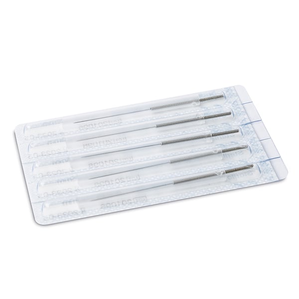 O seu recubrimiento de silicona permite uma inserção indolora. Especialmente indicada para punción seca Blíster com reverso de papel.