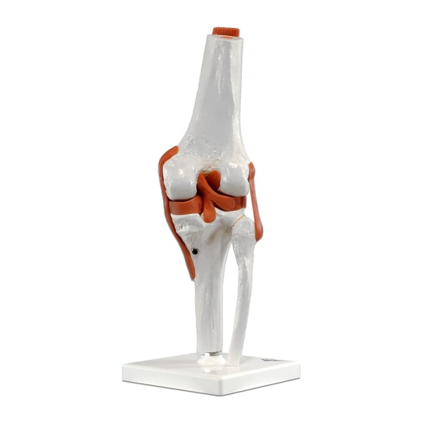 Este modelo funcional da articulação de joelho direita com ligamentos, de alta qualidade e em tamanho natural, representa de forma extraordinariamente detalhada a anatomia e as possibilidades de movimento fisiológicas. A coloração dos ossos moldados conforme com o seu original é extremamente realista. O cartílago nas superfícies articualres representa-se em cor azul. O modelo consta dos muñones de muslo, morna e peroné, os meniscos e a rótula.