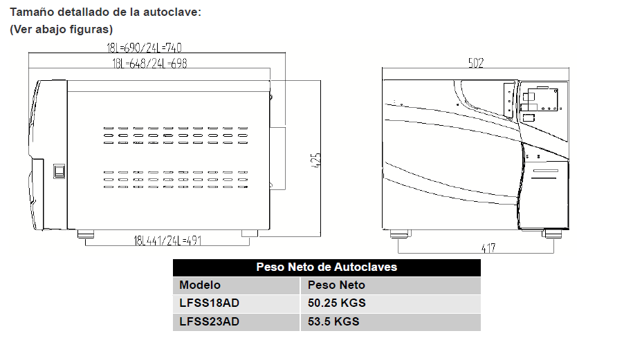 Tamanho detalhado da autoclave: