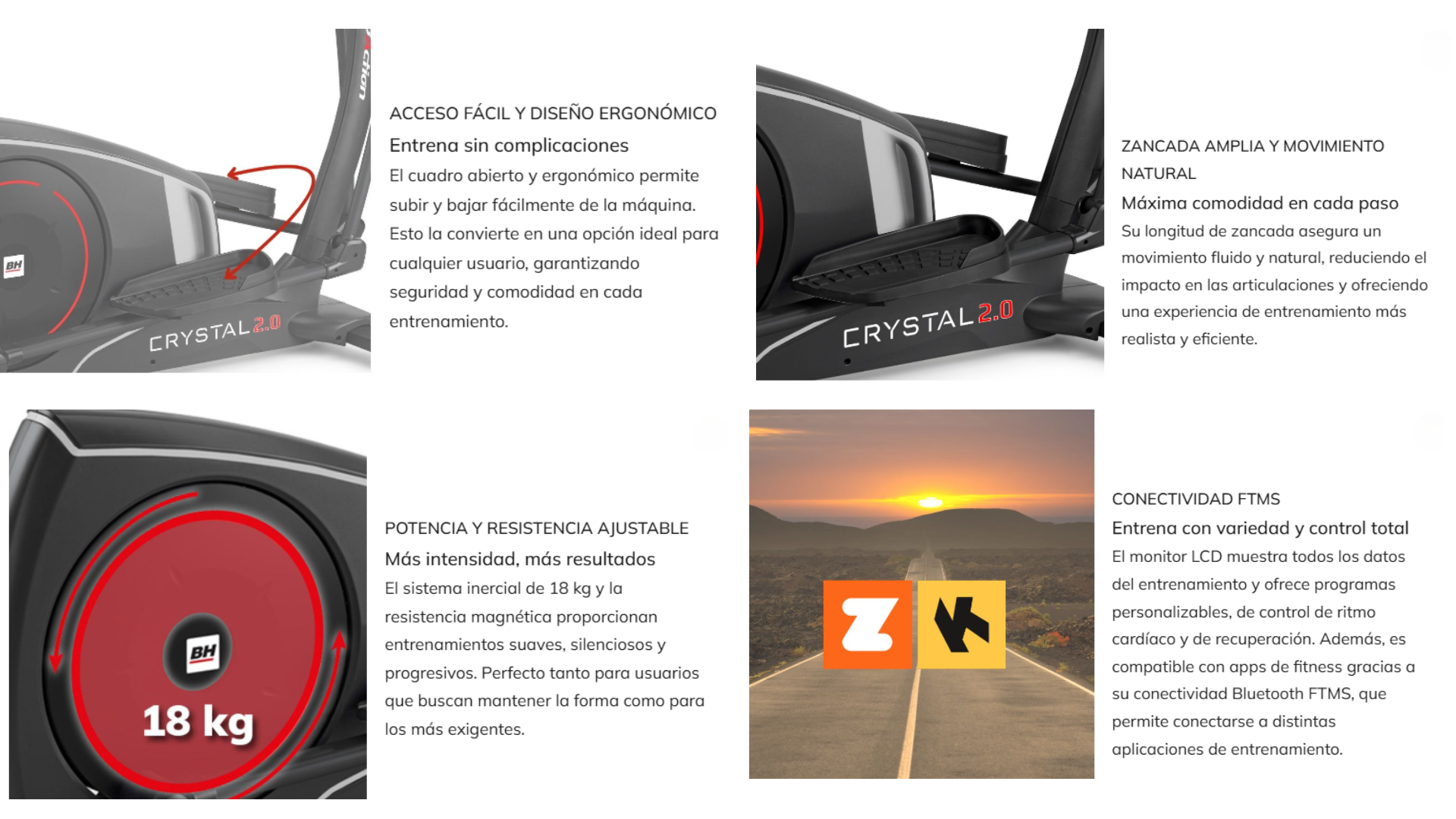 A BH Fitness Crystal 2.0 G2383Nem é uma elíptica de desenho moderno e ergonómico, ideal para treinamentos intensivos em casa. Combina um percurso fluído e natural com funções avançadas de treinamento e conectividade Bluetooth FTMS para usar com apps de fitness. A sua estrutura de acesso cómodo e os reposapiés XXL permitem um uso cómodo para todo o tipo de utentes, enquanto o seu sistema de resistência magnética e monitor programable oferecem um treinamento completo e variado.