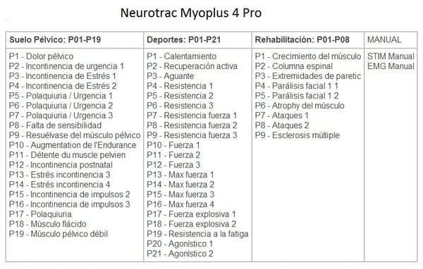 O eletroestimulador Neurotrac Myoplus 4 PRÓ revoluciona o mercado dos dispositivos de electroestimulación apresentando numerosas novidades como ecrã táctil a todo a cor e o seu sistema multifase que permite combinar EMG/ETS/STIM em um mesmo programa. A equipa Myoplus 2 PRÓ centra a sua tecnologia em proporcionar uma reeducación neuromuscular em uma larga gama de tratamentos desportivos, de reabilitação e fisioterapéuticos e resulta especialmente eficaz em tratamentos de chão pélvico.