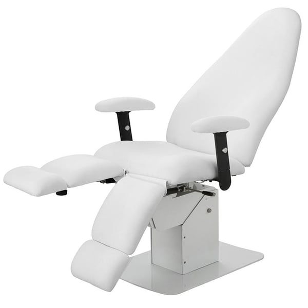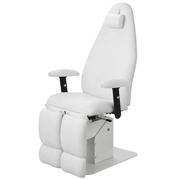 Cadeirão de podología de desenho minimalista com 1 motor para regular a altura, respaldo e reposapiés regulables independentemente mediante pistão de gás.