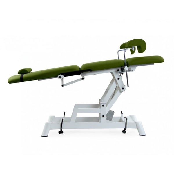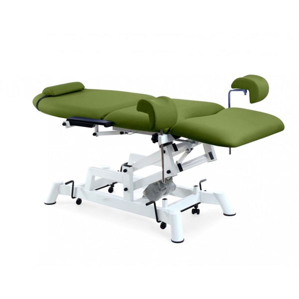 Cadeirão elétrico de reconhecimento ginecológico de três corpos. Consta de dois motores para a regulação de altura e respaldo mediante comando de mão. Inclui perneras ginecológicas, bandeja removível de aço inoxidável e almofada cervical ergonómico. Além disso, dispõe de posição Trendelenburg compensado.
