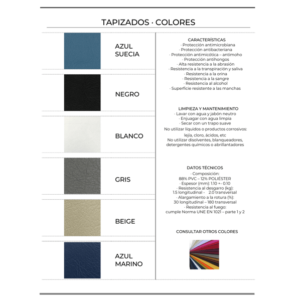 - Estofada e acolchada em polipiel sintético de cor a eleger, ignífugo, com interior de gomaespuma esponjosa de alta densidade.