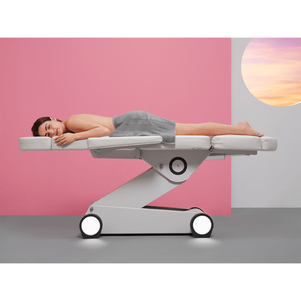 O Cadeirão marquesa de estética e beleza B-Light 502 é de alta gama e destaca pelo seu desenho inovador. Dispõe de 4 motores que controlam a altura, a inclinação do respaldo, do assento e do reposapiés. Reposabrazos e reposacabezas abatibles e removíveis. Estrutura de aço muito estável com luz LED branca integrada na base. Estofado PU branco de alta qualidade.