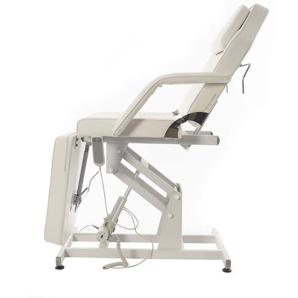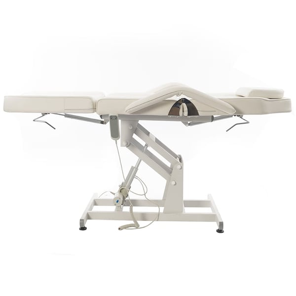 Cadeirão marquesa de estética Bucci: Elétrico com três corpos e regulação em altura, reposabrazos removíveis e buraco facial