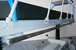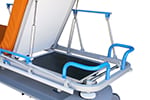 - Corrimões bilaterais plegables com enclave automático de segurança e proteção anti choque. Rodadura com 4 rodas de 200 mm., carenado plástico, com travão total simultâneo centralizado e roda servo direcional, acionado a ambos lados de marquesa, com sistema de quinta roda conductiva de 125 mm. com amortiguación. Conexão equipotencial. Asideros de empurre em cabeceira ergonómicos, 4 roldanas paragolpes e bandas anti rozaduras laterais.
