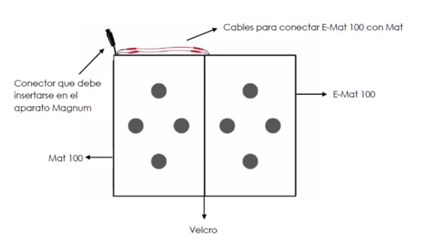 A colchoneta de magnetoterapia E-Mat 100 deve considerar-se uma extensão da colchoneta Mat 100, já que tem que se ligar com esta através de dois pequenos cabos de conexão.