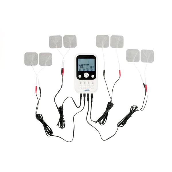 New Pocket Fit 4 é um eletroestimulador de quatro canais com alimentador de bateria recargable (incluído no pacote).