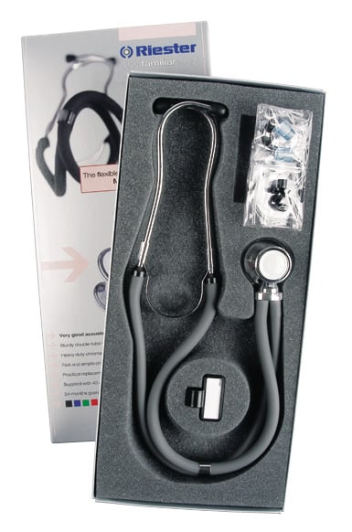 Estetoscopio Riester Ri - Rap Duplo Cano, 40 cm, Preto, Cabeça Dupla Cromada, em Caixa Expositora de Cartão