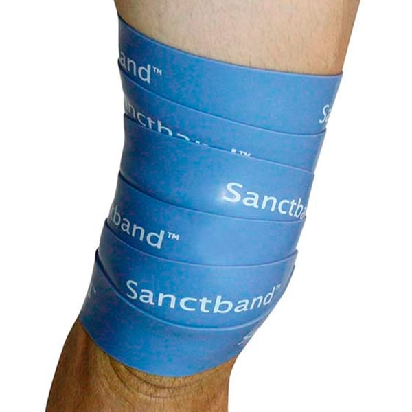 Flossband by Sanctband é uma banda de borracha natural que mede 2 metros de longo e 5 cm de largo e tem que ser aproximadamente 4-7 vezes mais grosso em comparação com uma banda média de academia. É forte e envolve-se firmemente ao redor da parte do corpo a tratar ou na articulação.