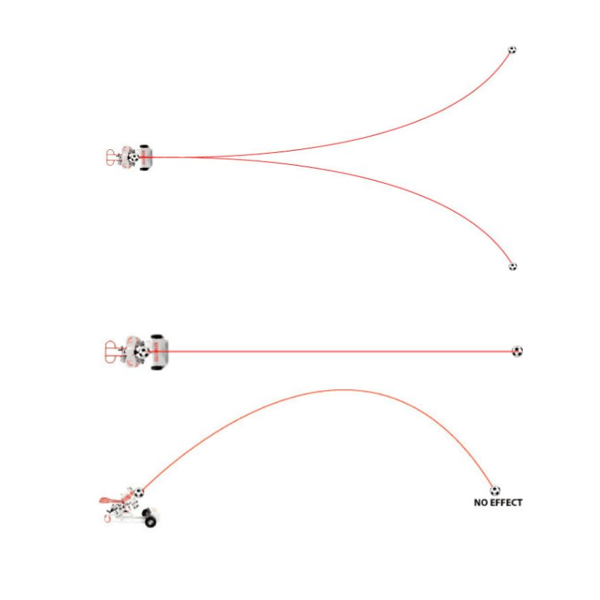 Se a velocidade é a mesma para ambas rodas, a bola terá uma trajetória reta, enquanto se as rodas têm velocidades diferentes, a bola sairá com uma trajetória curva.