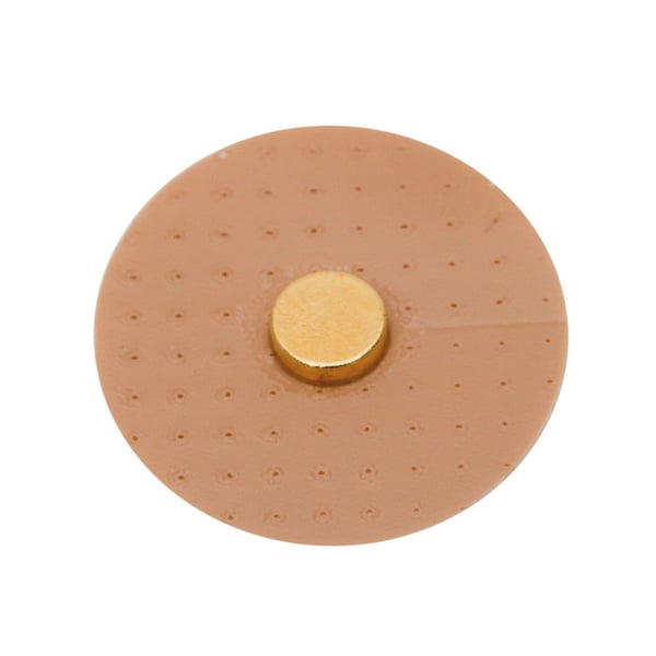 Ímanes banhados em ouro (6.000 Gaus) sobre adesivos cor bege. Com forma cilíndrica chata. Em direção do corpo encontra-se o pólo sul.