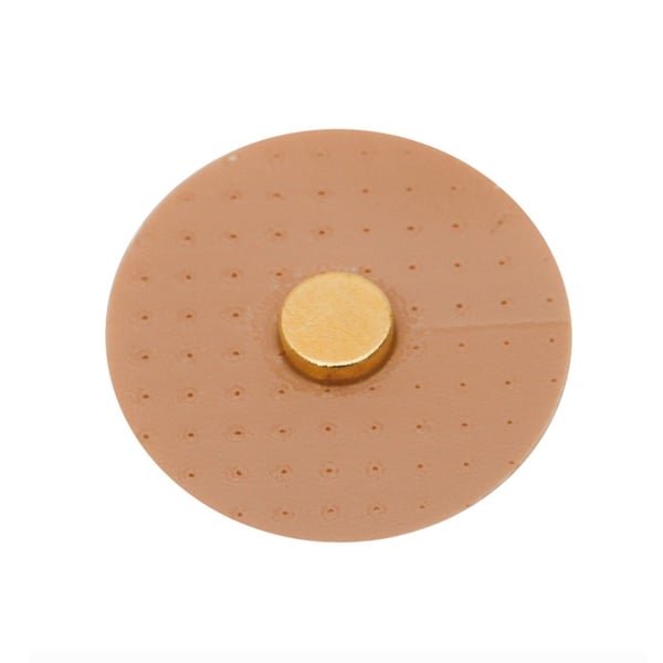 Ímanes banhados em ouro (9.000 Gaus) sobre adesivos cor bege. Com forma cilíndrica chata. Em direção do corpo encontra-se o pólo sul.