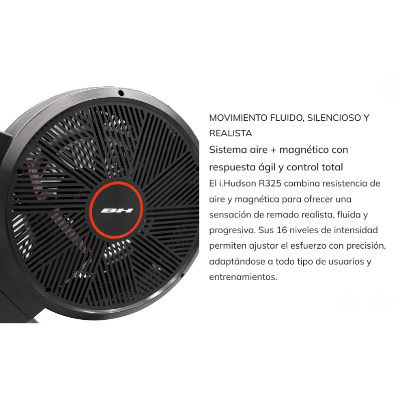 O BH Fitness i.Hudson R325 é uma máquina de remo doméstica desenhada para utentes que procuram um treinamento intensivo, fluído e silencioso, com uma experiência de uso ligada. Incorpora um sistema de resistência combinada de ar e magnética, pensado para oferecer uma remada mais realista e progressiva, junto de conectividade Bluetooth FTMS para enlaçar com aplicações interactivas como Kinomap e Zwift. Está orientado a um uso frequente em casa, com uma capacidade de treinamento de 7 a 20 horas semanais.