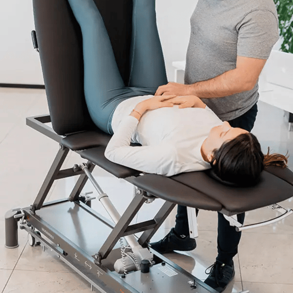 Marquesa elétrica para osteopatia de sete corpos, altura variável e função cifosis assistida. Elevação rápida em 43 segundos.
