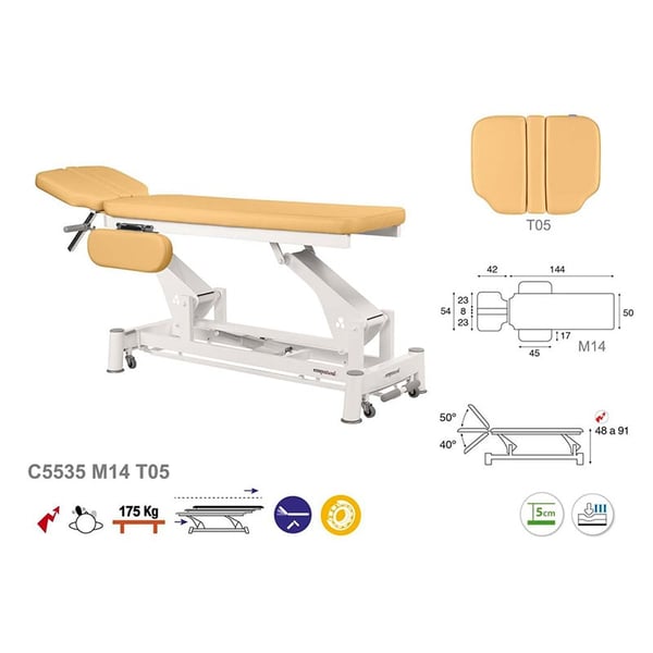 Marquesa elétrica de duas colunas, dois corpos e elevação vertical com braços abatibles e inclinação da cabeça até 40º em negativo e 50º standard. Tem um desenho singelo, moderno e funcional. Outra das grandes vantagens que contribui a marquesa é a sua versatilidad já que resulta ideal para numerosos campos: fisioterapia, osteopatia, medicina geral, estética, tatuagens. Uma solução perfeita para qualquer profissional da saúde e a estética.