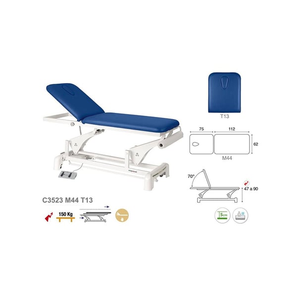 Nova, moderna e versátil marquesa Ecopostural de dois corpos com sistema de elevação elétrico e estrutura de biela branca. Consta de cabeça oscilante, tampa facial, recheado de espuma de vários graus de firmeza e estofado de classe M2. Assim mesmo, conta com uma estrutura de aço de bielas com rolamentos e rodas escamoteables que fazem mais fácil a deslocação lateral da mesma.