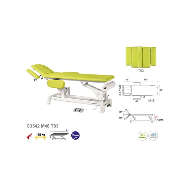 Inovadora marquesa elétrica de modalidade técnica Ecopostural, composta de dois corpos e com um sistema de elevação elétrico. Consta de uma estrutura de aço de bielas com rolamentos e rodas escamoteables que facilitam a sua deslocação lateral. Conta com um recheado de espuma de vários níveis de grossura e um estofado de classe M2. Além disso, tem uma cabeça basculante, com tampa facial e braços em leque que contribuem um maior conforto tanto ao profissional como ao paciente.