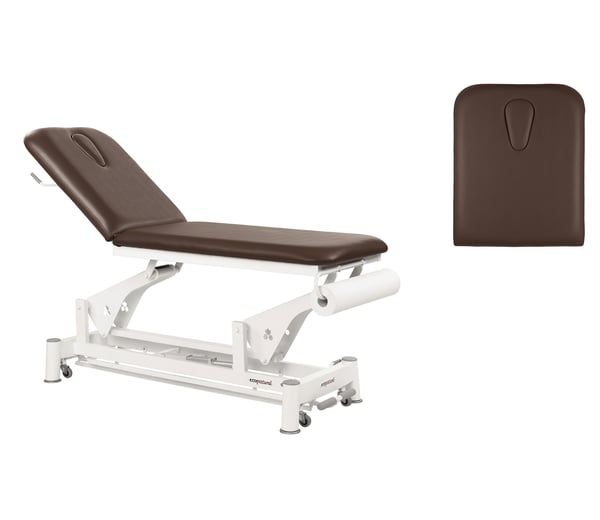 Nova, moderna e versátil marquesa Ecopostural de dois corpos com sistema de elevação elétrico e estrutura de biela branca. Consta de cabeça oscilante, tampa facial, recheado de espuma de vários graus de firmeza e estofado de classe M2. Assim mesmo, conta com uma estrutura de aço de bielas com rolamentos e rodas escamoteables que fazem mais fácil a deslocação lateral da mesma.