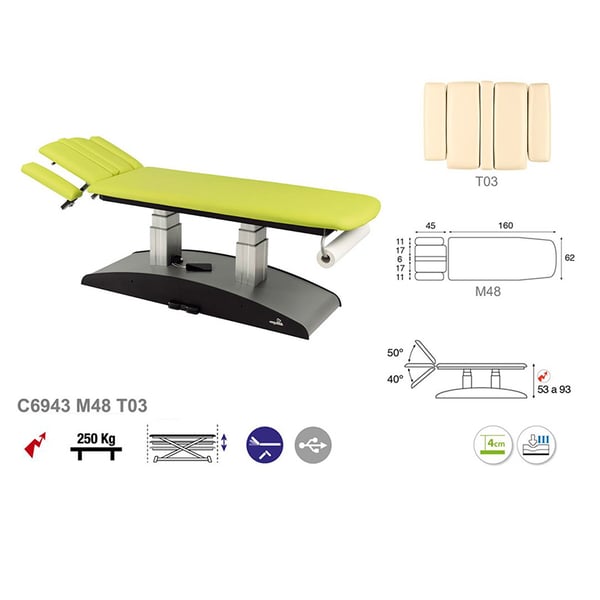 Marquesa elétrica de duas colunas, dois corpos e elevação vertical com uma cabeça reclinable até 90º com portarrolos incluído. Tem um desenho singelo, moderno e funcional. Outra das grandes vantagens que contribui a marquesa é a sua versatilidad já que resulta ideal para numerosos campos: fisioterapia, osteopatia, medicina geral, estética, tatuagens. Uma solução perfeita para qualquer profissional da saúde e a estética.