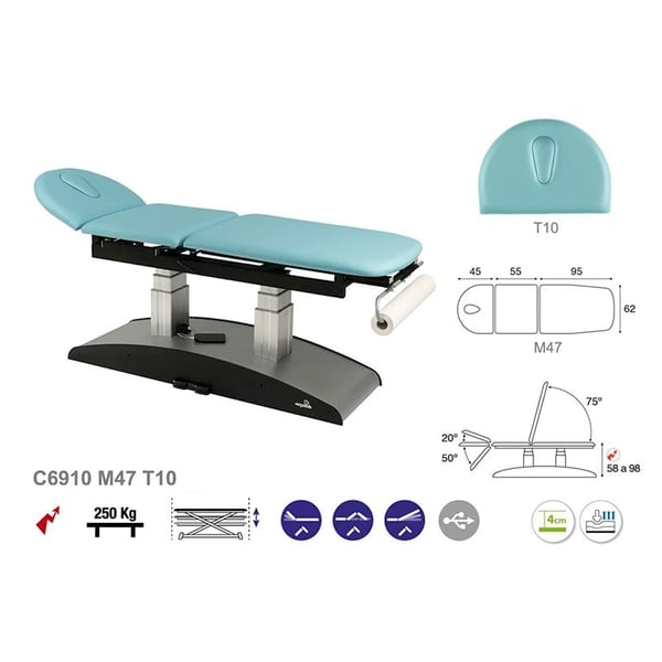 Marquesa elétrica de duas colunas, três corpos e elevação vertical com uma cabeça semicircular. Tem um desenho singelo, moderno e funcional. Outra das grandes vantagens que contribui a marquesa é a sua versatilidad já que resulta ideal para numerosos campos: fisioterapia, osteopatia, medicina geral, estética, tatuagens. Uma solução perfeita para qualquer profissional da saúde e a estética.