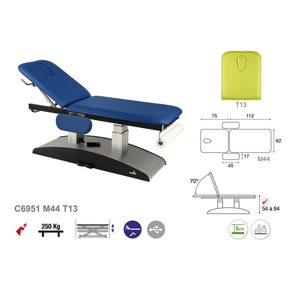 Marquesa elétrica de duas colunas, três corpos e elevação vertical com braços abatibles e cabeça tipo T04. Tem um desenho singelo, moderno e funcional. Outra das grandes vantagens que contribui a marquesa é a sua versatilidad já que resulta ideal para numerosos campos: fisioterapia, osteopatia, medicina geral, estética, tatuagens. Uma solução perfeita para qualquer profissional da saúde e a estética.