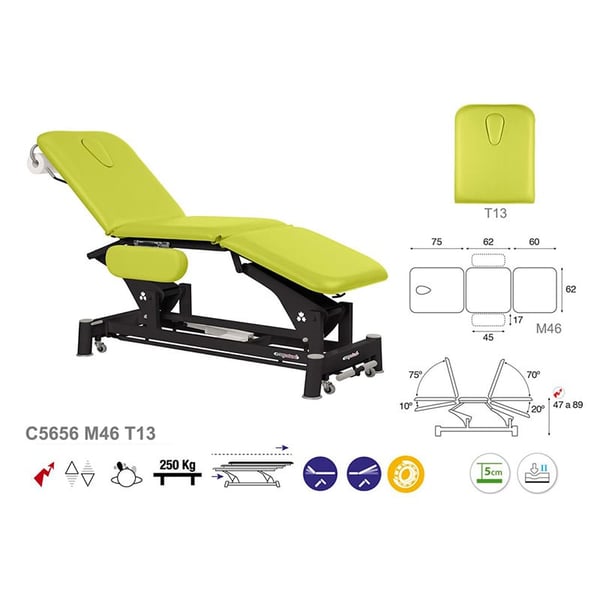 Inédita, ligeira e renovada marquesa Ecopostural de três corpos com estrutura de biela preta e sistema de elevação elétrico. Está composta por uma cabeça reclinable em negativo até 10º com tampa facial, braços abatibles, um recheado de espuma de vários graus de firmeza e estofado da classe M2. Além disso, conta com uma estrutura de aço de bielas com rolamentos e rodas escamoteables que fazem mais singelo a deslocação lateral da mesma.