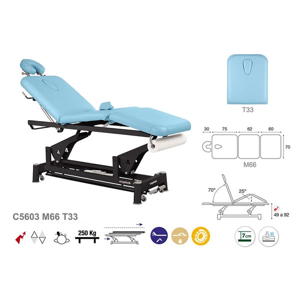 Inédita, ligeira e renovada marquesa Ecopostural de três corpos com estrutura de biela preta e sistema de elevação elétrico. Está composta por uma cabeça oscilante, uma tampa facial, um recheado de espuma de vários graus de firmeza e estofado da classe M2. Além disso, conta com uma estrutura de aço de bielas com rolamentos e rodas escamoteables que fazem mais singelo a deslocação lateral da mesma.