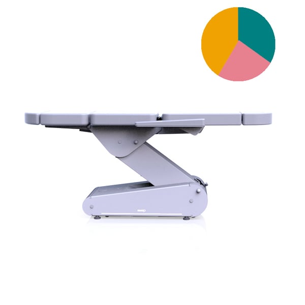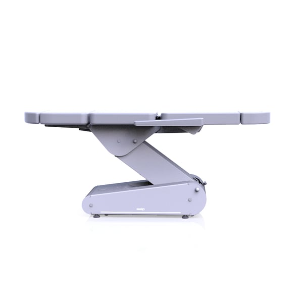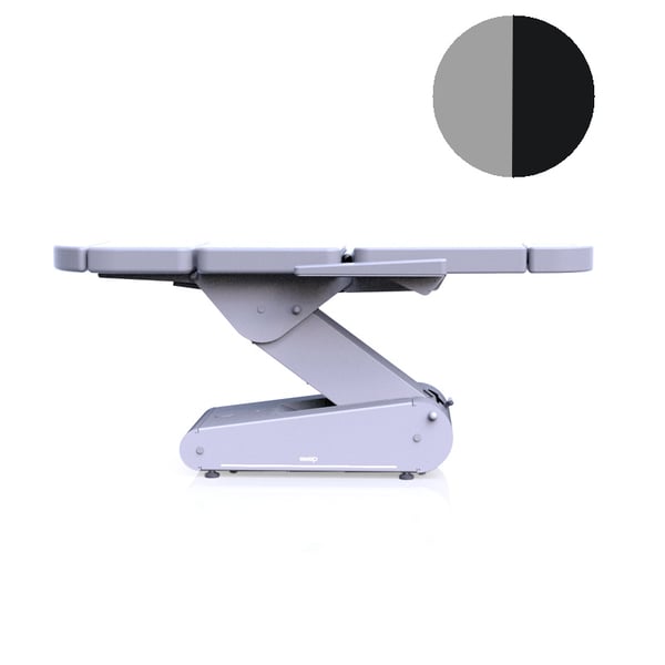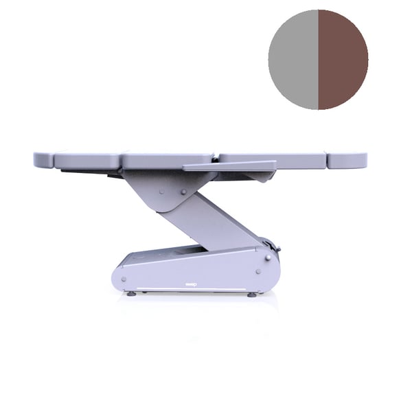O modelo de estética Swop dispõe de cinco secções para realizar tratamentos com o paciente completamente tumbado ou em posição semi-incorporada. A marquesa leva de série a iluminação Led com luz branca e o sistema de 4 rodas 360º com bloqueio e desbloqueio mediante alavanca.