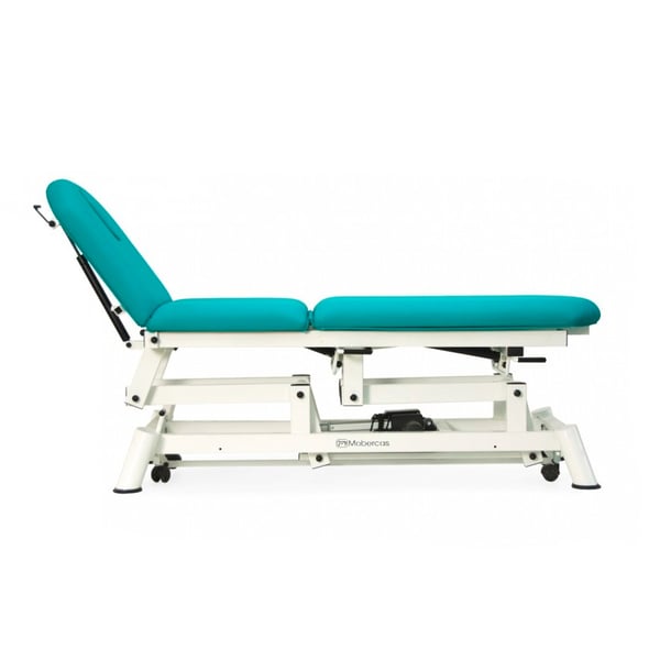 Marquesa elétrica para osteopatia: três corpos, com respaldo reclinable em negativo, portarrolos, tampa facial e rodas escamoteables