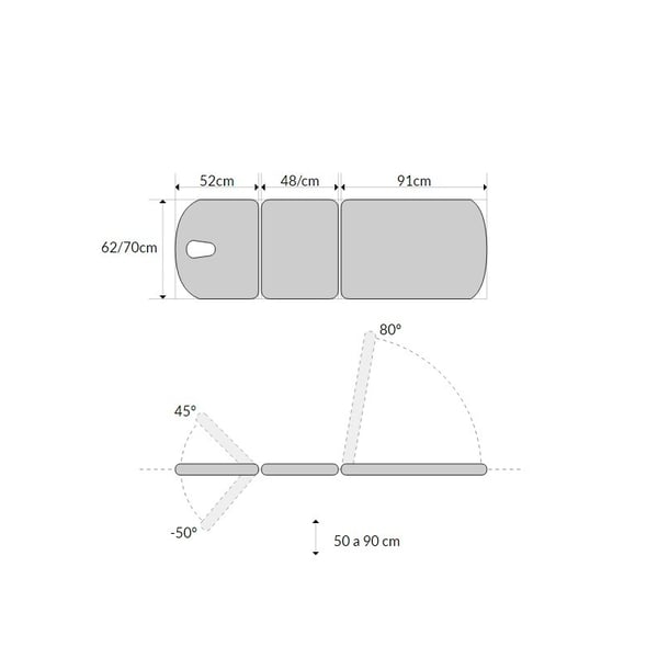 Marquesa electrica de três corpos, com respaldo reclinable em negativo, tipo cadeirão com piecera (terceiro corpo) elevable mediante pistão de gás. Inclui portarrolos e tampa facial . Desenhada especialmente para tratamentos de osteopatia.