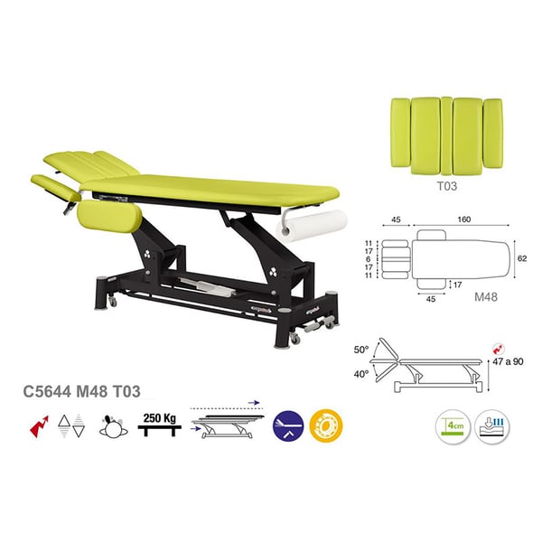 Inovadora marquesa elétrica de modalidade técnica Ecopostural, composta de dois corpos e com um sistema de elevação elétrico. Consta de uma estrutura de aço de bielas com rolamentos e rodas escamoteables que facilitam a sua deslocação lateral. Conta com um recheado de espuma de vários níveis de grossura e um estofado de classe M2. Além disso, tem braços abatibles e uma cabeça basculante com tampa facial, o que contribui um maior conforto para o profissional e o paciente.