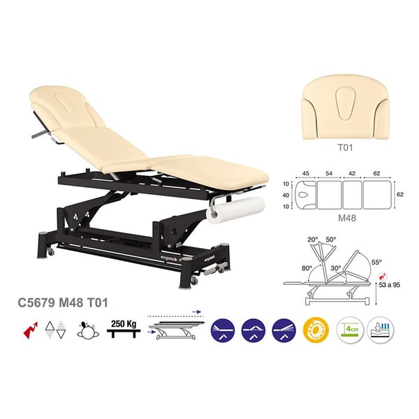 Inovadora marquesa elétrica de modalidade técnica Ecopostural, composta de quatro corpos e com um sistema de elevação elétrico. Consta de uma estrutura de aço de bielas com rolamentos e rodas escamoteables que facilitam a sua deslocação lateral. Conta com um recheado de espuma de vários níveis de grossura e um estofado de classe M2. Além disso, tem uma cabeça basculante que inclui tampa facial que oferecem um maior conforto para o profissional e o paciente.