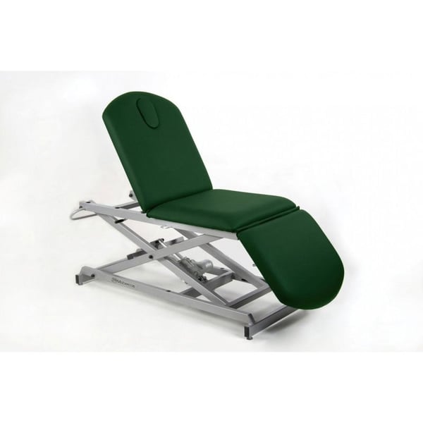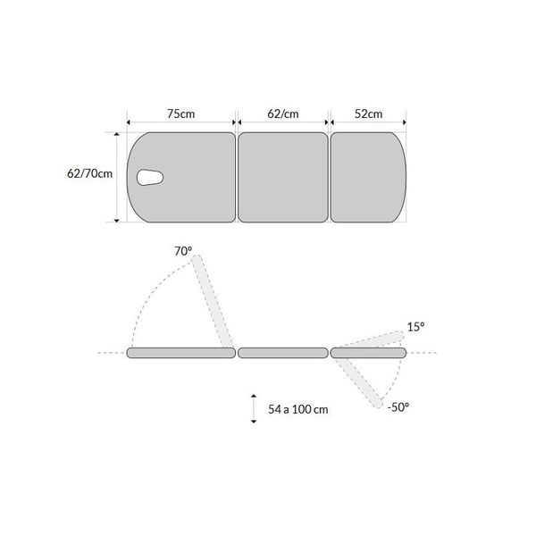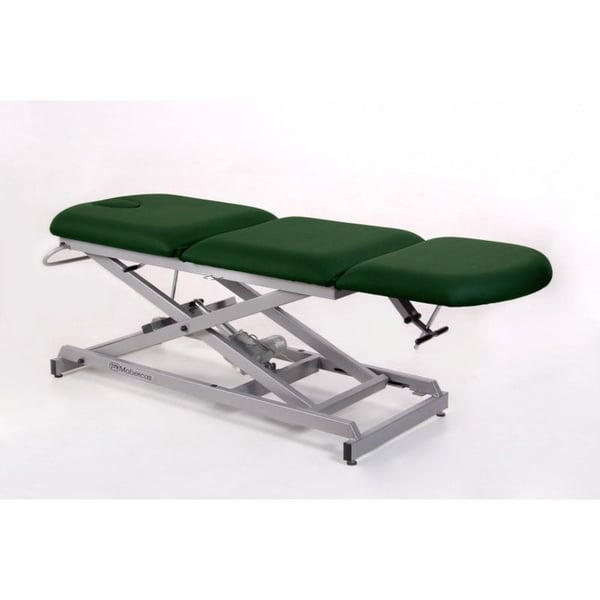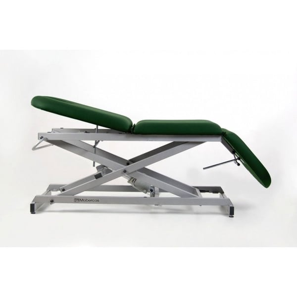 Marquesa elétrica de três corpos, tipo cadeirão, com subida reta sem deslocação lateral, portarrolos e tampa facial. Disponível com rodas escamoteables. Desenhada especialmente para tratamentos de fisioterapia e reabilitação.
