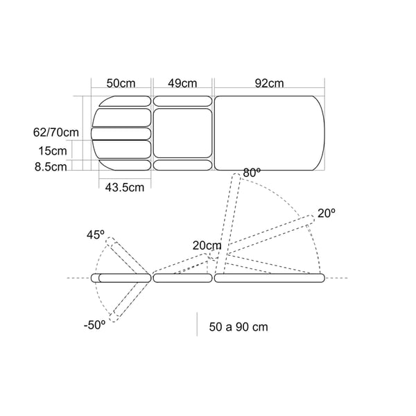 - Funcionalidades mediante dois pistões de gás: piecera (terceiro corpo), dobra central, Trendelenburg
