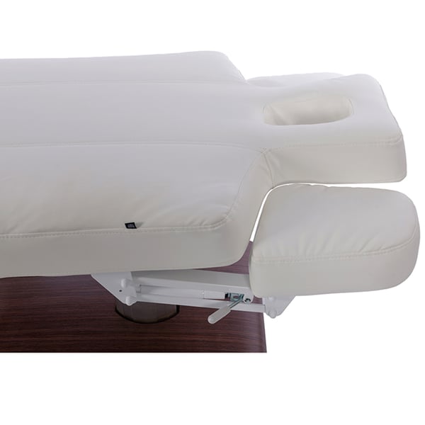 Tem reposabrazos ajustables e cabeça com buraco facial, a sua estrutura é metálica com acabamento de madeira cor natural ou escuro e o seu acolchado ultrablando de grande conforto com estofado PU branco é de alta qualidade.