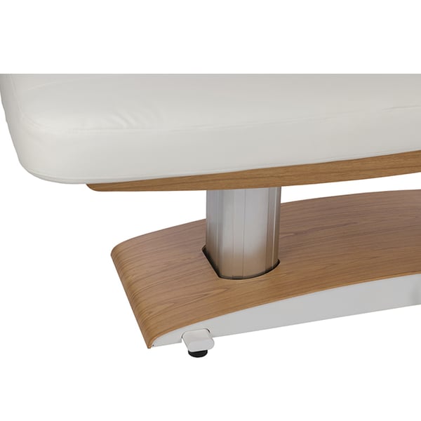 Tem reposabrazos ajustables e cabeça com buraco facial, a sua estrutura é metálica com acabamento de madeira cor natural ou escuro e o seu acolchado ultrablando de grande conforto com estofado PU branco é de alta qualidade.
