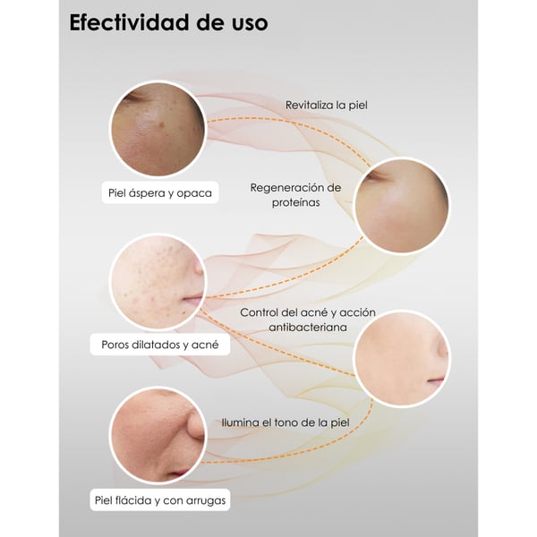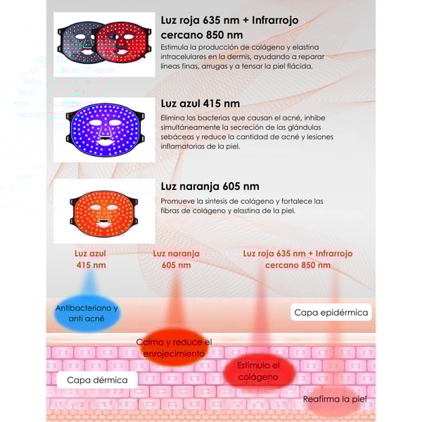 - Emite luzes em várias longitudes de onda (incluídas azul, laranja, vermelho e infravermelho próximo) para tratar diferentes aspetos da pele.