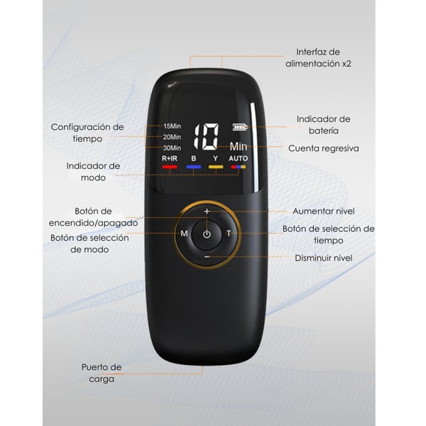 - Emite luzes em várias longitudes de onda (incluídas azul, laranja, vermelho e infravermelho próximo) para tratar diferentes aspetos da pele.