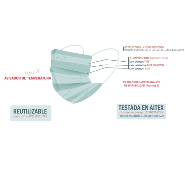 - Máscara higiénica reutilizável segundo norma UNE0065:2020. Declarada em Aitex com número de relatório de ensaio 2020TM4286 com data de finalização 31 de agosto de 2020.