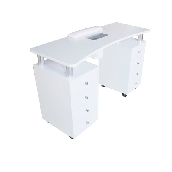Mesa de manicura Distal: Com dupla coluna com gavetas, saca e almofada reposamanos