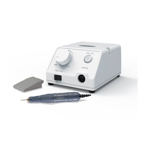 O micromotor Escort III de Marathon é um micromotor portable e potente de escovas. Goza de um desenho ergonómico de fácil agarre e adequado para evitar a fadiga durante o trabalho e um sistema de ignição e apagado diretamente no suporte. Consta de uma velocidade de trabalho de 35.000 rpm. Recomendamos não superar a velocidade com tal de evitar um desgaste prematuro da peça.
