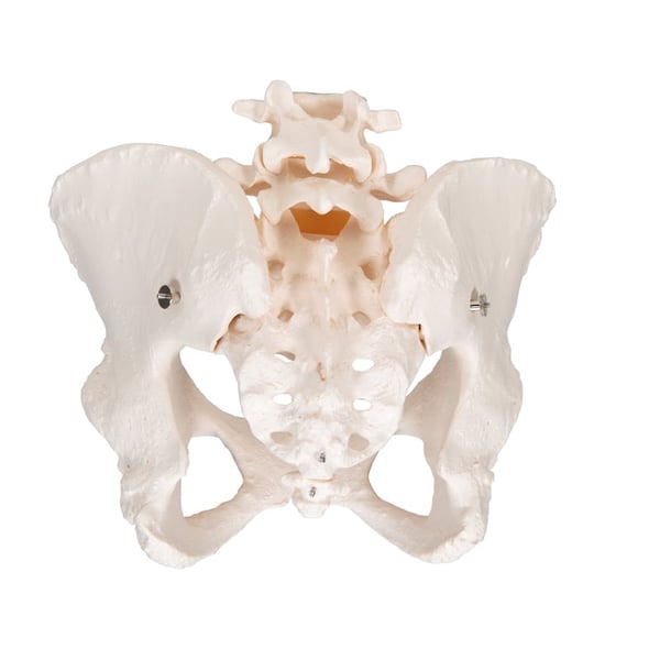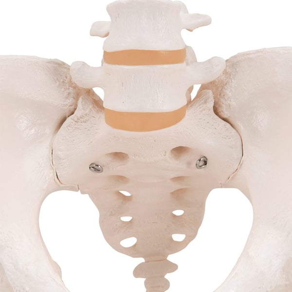 Modelo anatómico do esqueleto da pelvis feminino que consta dos ossos do quadril, o sacro com coxis e dois discos lumbares com sínfisis móvel