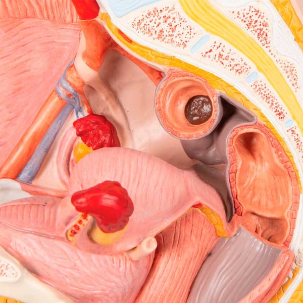 O modelo anatómico de pelvis feminina de duas peças em forma de corte médio apresenta todas as estruturas importantes da pélvis. Uma metade dos órgãos genitais com a vejiga e o reto é desmontable para os estudos em detalhe.