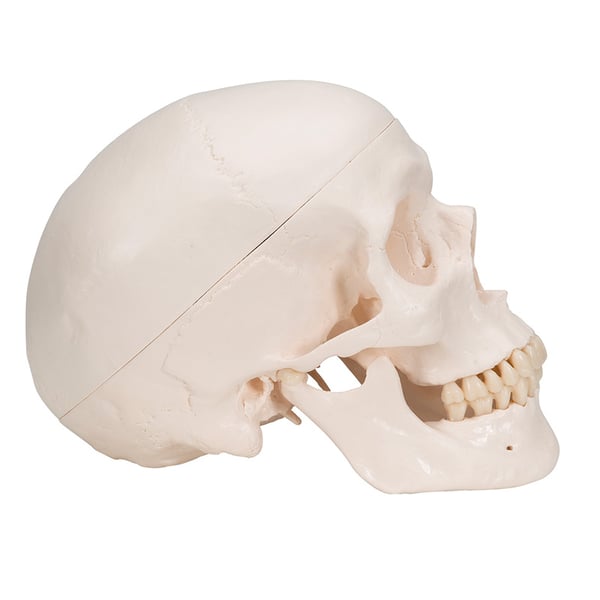 O modelo de crânio clássico de três partes é uma primeira opção dirigida a estudar a anatomia básica. Simula uma reprodução muito exata do crânio humano e está fabricado e terminado manualmente com um material resistente e irrompible.