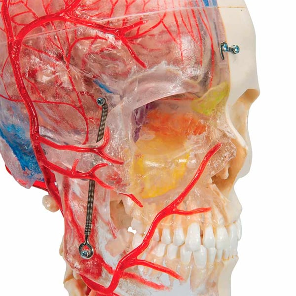 O novo modelo de crânio didático de luxo Bonelike esclarece todas as dúvidas anatómicas. Dá a possibilidade de conhecer estruturas na metade transparente do crânio e os ossos na metade óssea.