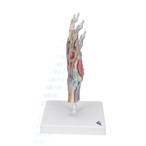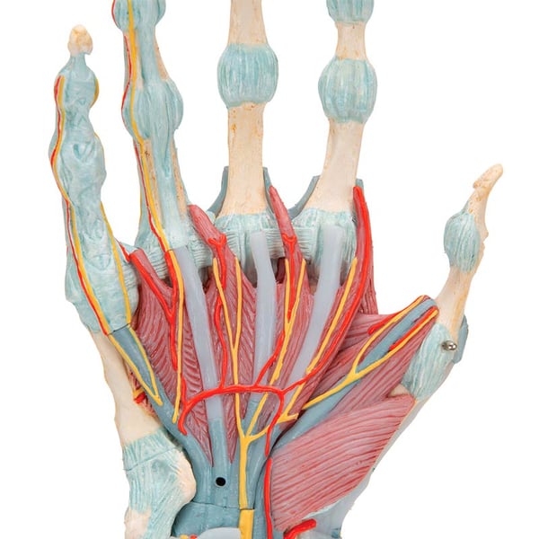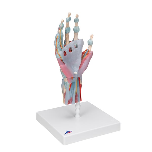 O modelo do esqueleto da mão com ligamentos e músculos é de alta qualidade e consta de 4 partes. Amostra todos os ossos, músculos, tendões, ligamentos, nervos, artérias e veias da mão e o antebrazo inferior.