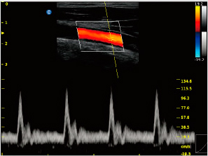 - Cor Doppler (diferentes unidades de cor, dependendo da velocidade e direção do fluxo sanguíneo)