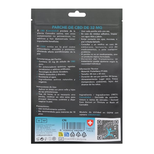 Parche transdérmico com 32 mg de CBD isolado (sem THC) e libertação prolongada durante 24 horas. Transparente, discreto, vegano e desenhado para uma aplicação cómoda e eficaz ao longo do dia, com um adesivo pensado para a pele do homem. Bem-estar Natural com Biodisponibilidade >99%